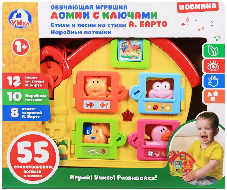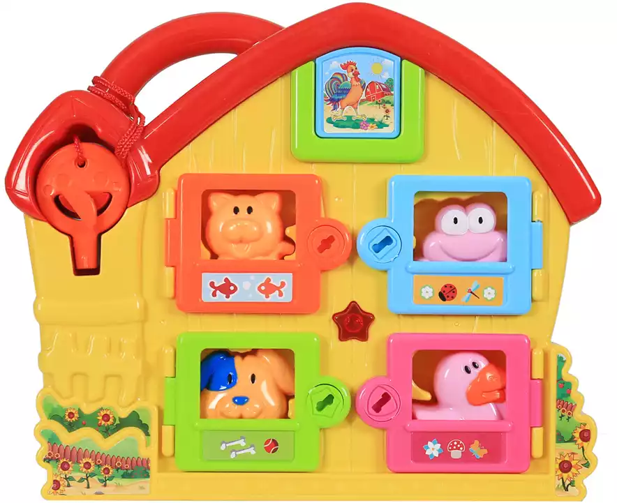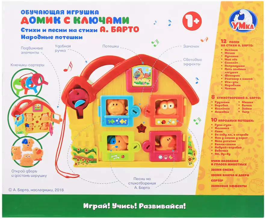 Играя, малыш сможет расставить фигурки животных в их домики, предварительно открыв каждую дверь своим ключом. Песенки, потешки, звуки, световые эффекты и множество интересных функций увлекут малыша и поднимут ему настроение. Благодаря удобной ручке игрушку удобно брать с собой на прогулку или в поездки.