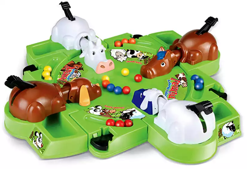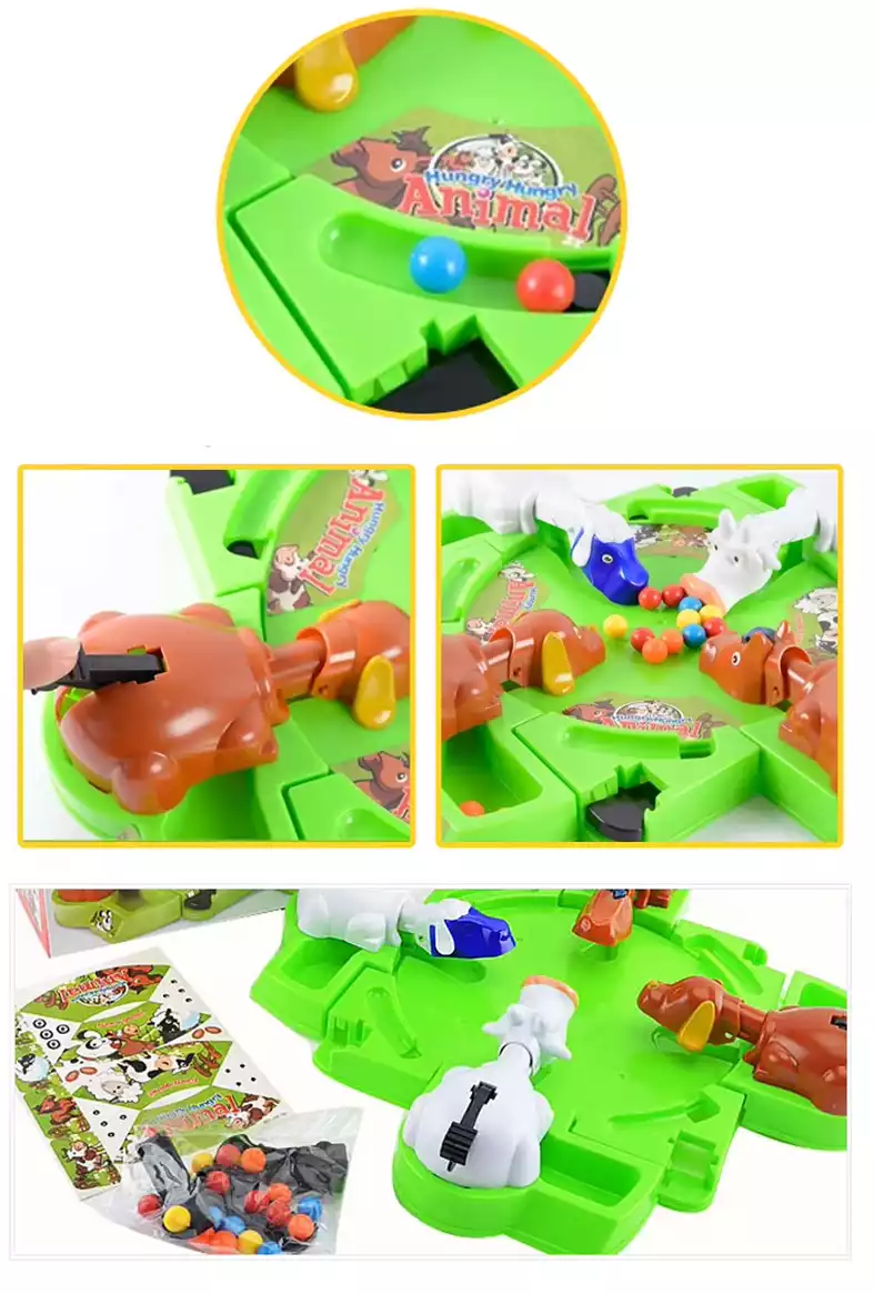 В корзинуНастольная игра выполнена в виде игрового поля, стилизованного под зеленую лужайку на которой пасутся животные с фермы. Каждый игрок выбирает себе животное, которое ему больше нравится: корову, лошадку, собачку или овечку. Перед игрой нужно положить 5 шариков в желобок, расположенный рядом с выбранным животным и нажать на рычаг. Так шарики попадут в центр поля, где их смогут «съесть» животные. Задача игроков – быстрее других накормить свое животное, и если оно собрало шариков больше остальных – вы победили. Игра способствует развитию глазомера, ловкости, реакции, координации движений и моторики.