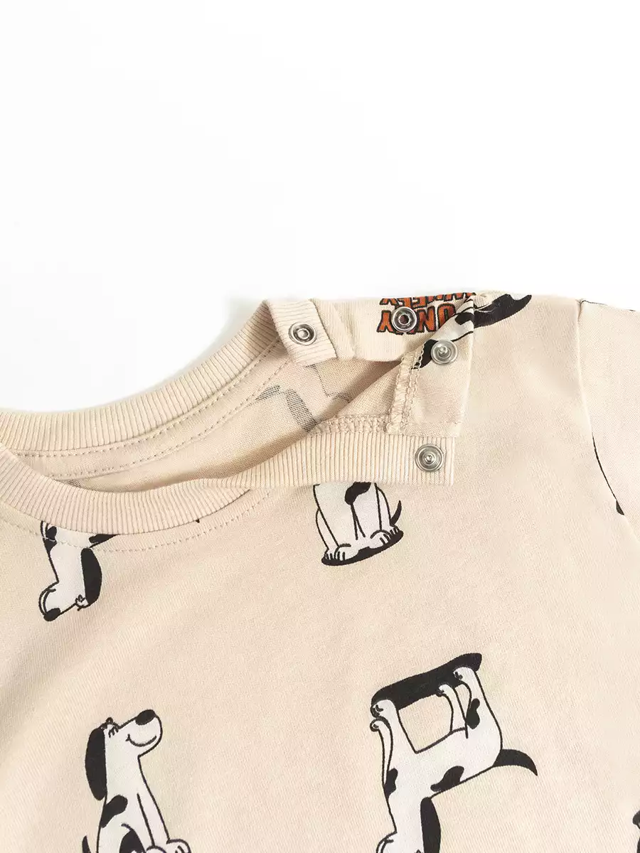 Хлопковый лонгслив с забавными собаками - незаменимая вещь в детском гардеробе. Заниженная линия плеча, застежка на кнопки, свободный крой, обработанная горловина. Лонгслив подойдет для повседневной носки дома, в детский сад, на прогулку летом или поздней весной, а также осенью и зимой как поддева под верхнюю одежду.