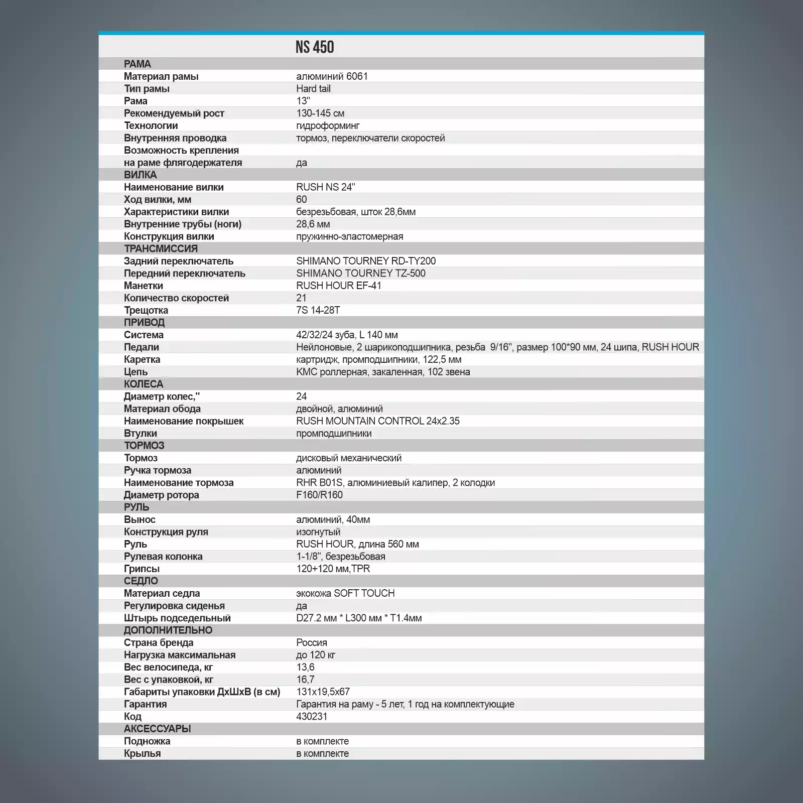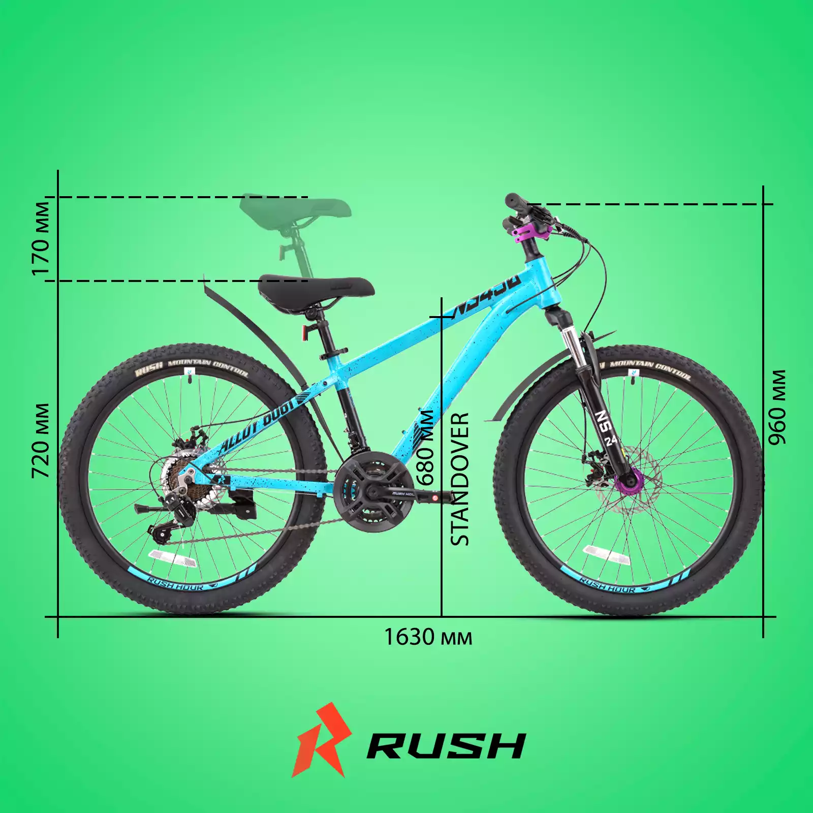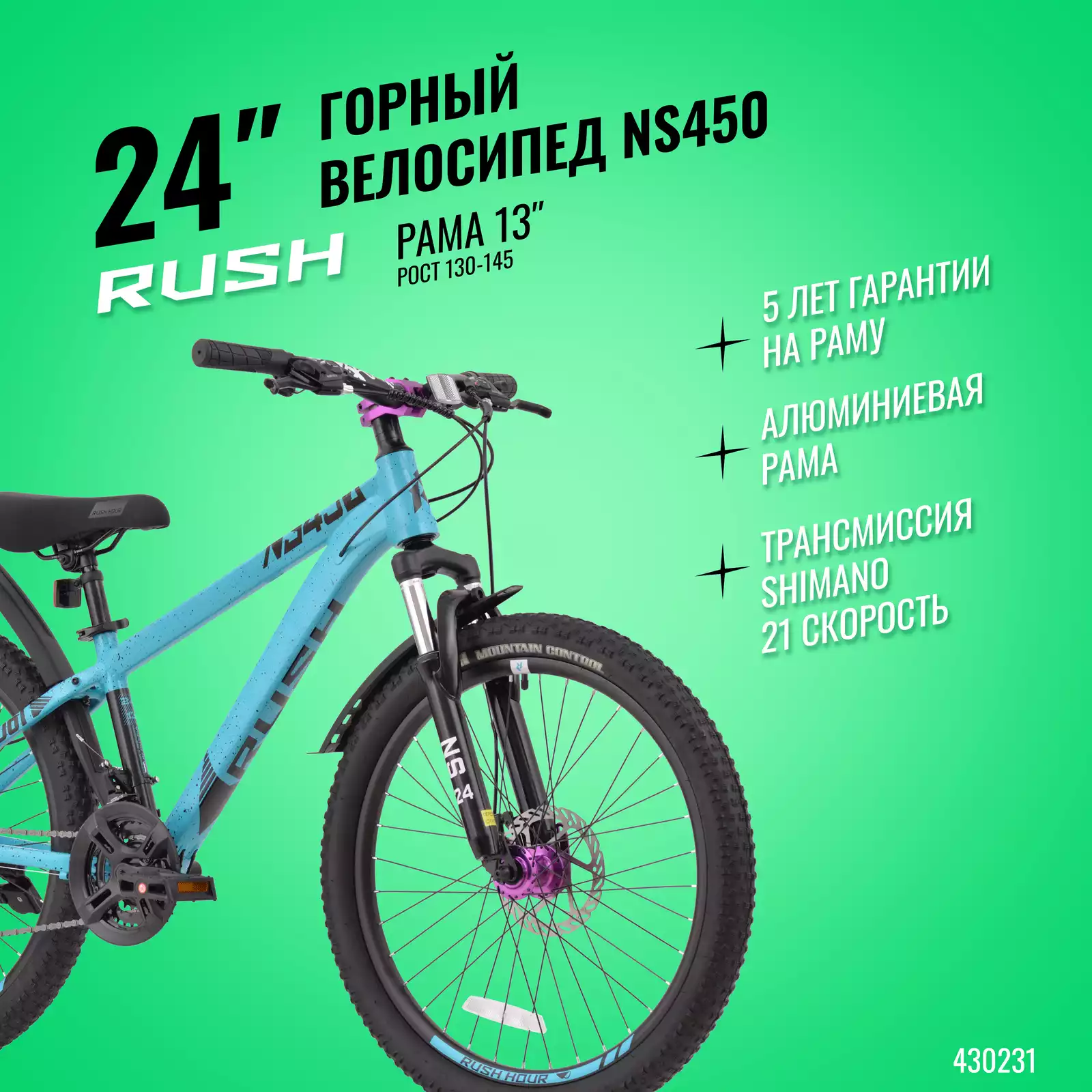 Алюминиевый горный велосипед RUSH NS450 24 дюйма с дисковыми тормозами подойдет для подростков ростом 130-145 см. Рама хардтейл 13 с заводской гарантией 5 лет изготовлена из алюминиевого сплава 6061 с применением технологии гидроформинга и внутренней проводки тросов. Трансмиссия 21 скоростная, задний переключатель SHIMANO TOURNEY RD-TY200, передний переключатель SHIMANO TZ-500, на руле манетки RUSH HOUR EF-41 (комбиручки), цепь роллерная, закаленная KMC Z7. Промподшипники во втулках и каретке помогут забыть об обслуживании и регулировках. Вилка серии NS пружинно-эластомерная с ходом 60 мм, обеспечит больший комфорт при катании. На штанах вилки установлены пыльники, которые защищают хромированные ноги от воздействия пыли и грязи. Двойной алюминиевый обод рассчитан на нагрузку до 120 кг. Премиум покрышки MOUNTAIN CONTROL шириной 2,35 обеспечат отличный накат и сцепление с дорогой. Мягкое сиденье с покрытием SOFT TOUCH регулируется по высоте без ключей, с помощью эксцентрика. Вес велосипеда 13,6 кг. На нижней трубе есть крепеж для держателя бутылки или насоса. Крылья, подножка и защита цепи в подарок. Мы контролируем все этапы создания велосипедов RUSH HOUR: контроль входящих комплектующих; правильность установки и настройки оборудования; взвешивание; проверка комплектности и правильности упаковки.