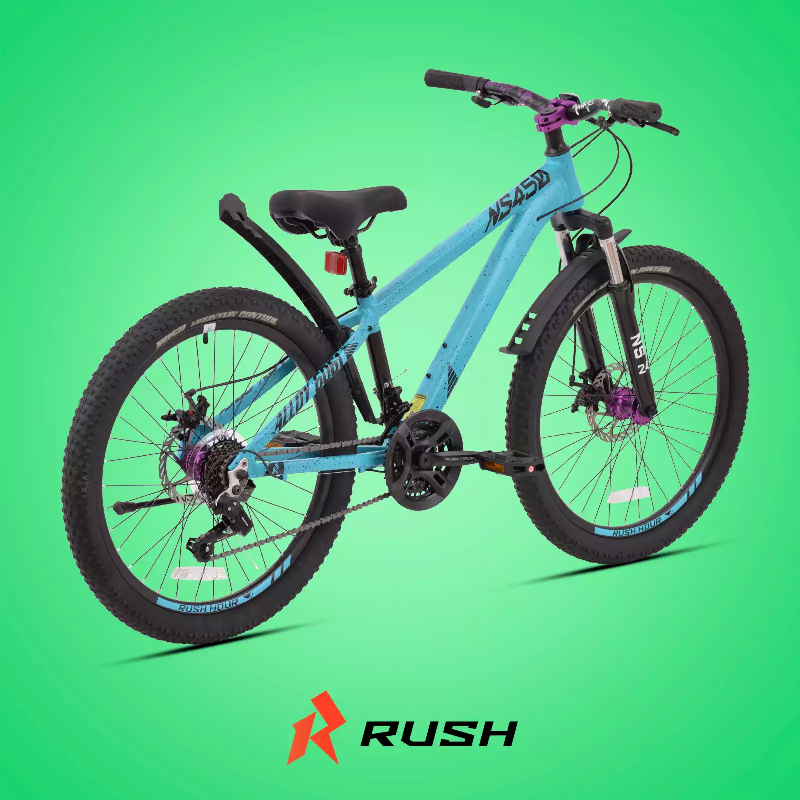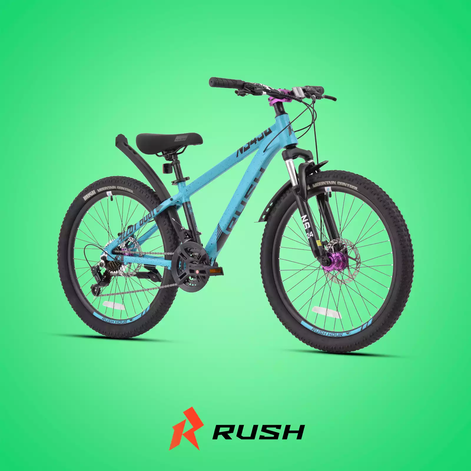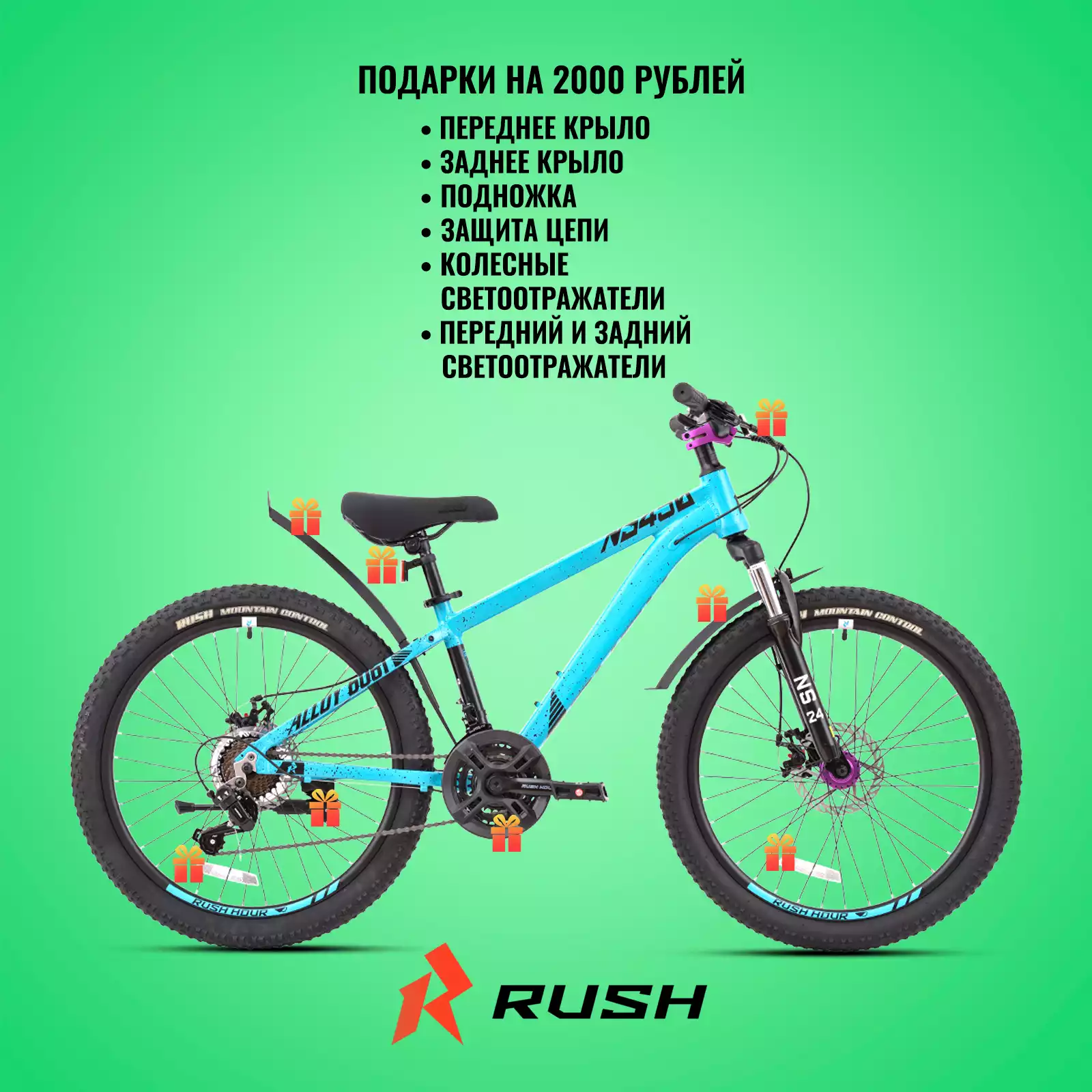 Алюминиевый горный велосипед RUSH NS450 24 дюйма с дисковыми тормозами подойдет для подростков ростом 130-145 см. Рама хардтейл 13 с заводской гарантией 5 лет изготовлена из алюминиевого сплава 6061 с применением технологии гидроформинга и внутренней проводки тросов. Трансмиссия 21 скоростная, задний переключатель SHIMANO TOURNEY RD-TY200, передний переключатель SHIMANO TZ-500, на руле манетки RUSH HOUR EF-41 (комбиручки), цепь роллерная, закаленная KMC Z7. Промподшипники во втулках и каретке помогут забыть об обслуживании и регулировках. Вилка серии NS пружинно-эластомерная с ходом 60 мм, обеспечит больший комфорт при катании. На штанах вилки установлены пыльники, которые защищают хромированные ноги от воздействия пыли и грязи. Двойной алюминиевый обод рассчитан на нагрузку до 120 кг. Премиум покрышки MOUNTAIN CONTROL шириной 2,35 обеспечат отличный накат и сцепление с дорогой. Мягкое сиденье с покрытием SOFT TOUCH регулируется по высоте без ключей, с помощью эксцентрика. Вес велосипеда 13,6 кг. На нижней трубе есть крепеж для держателя бутылки или насоса. Крылья, подножка и защита цепи в подарок. Мы контролируем все этапы создания велосипедов RUSH HOUR: контроль входящих комплектующих; правильность установки и настройки оборудования; взвешивание; проверка комплектности и правильности упаковки.